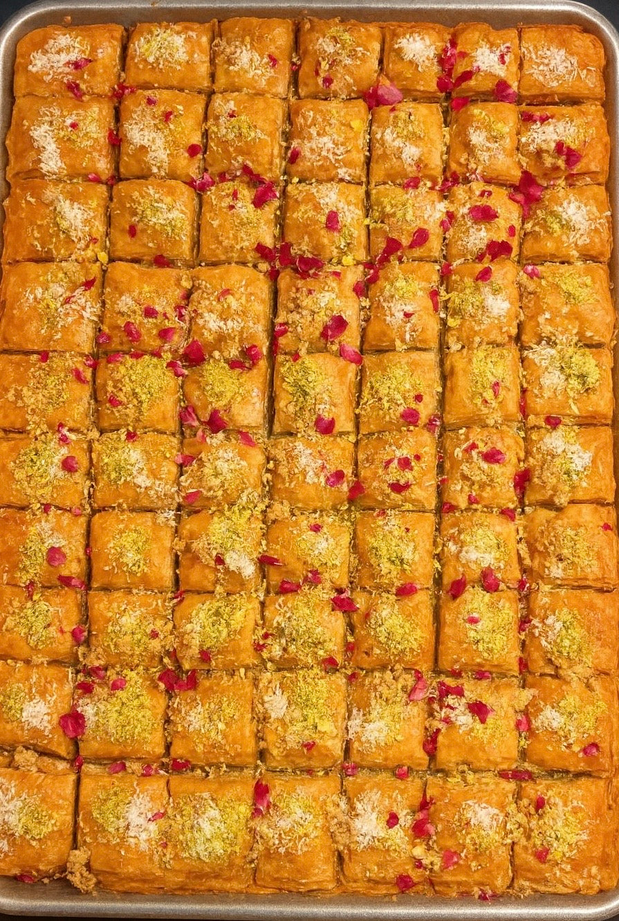 Hawaiian Style Baklava is a delectable dessert that combines the tropical flavors of Hawaii with the indulgent, rich, and buttery qualities of traditional baklava. It is a distinctive and mouth watering dish, a rich and buttery treat featuring phyllo dough filled with crushed macadamia nuts, walnut, and finely crushed pistachio. Sweetened with a tropical syrup of sugar, lemon juice, pineapple, and finished with rose petals,coconut shredded, milk, and tapioca starch.